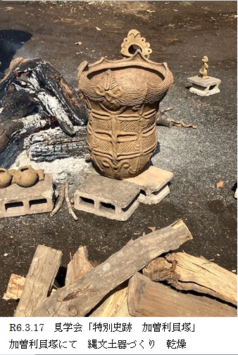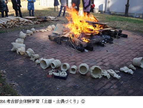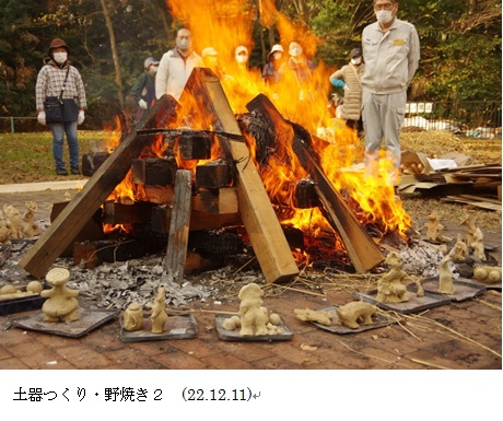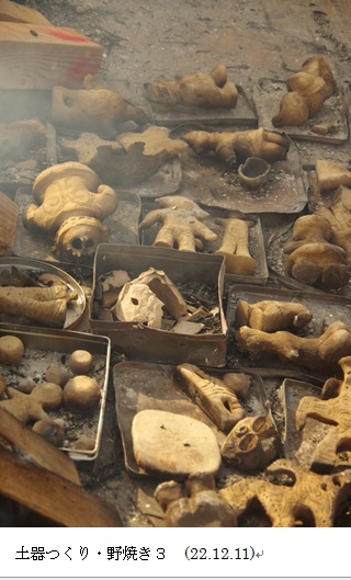 2週目は会員作成の土器や土偶を参考に形づくりを行いました。 3週目は磨きをかけ、充分に乾燥を経た12月8日に焼きあげを行いました。 天候にも恵まれ、1点も破裂することがなく無事に終えることができました。