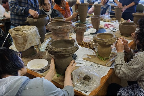 4、土器づくりの形づくり あらかじめ用土づくりした粘土を使用し、博物館収蔵の本物の土器を見ながら作成します。