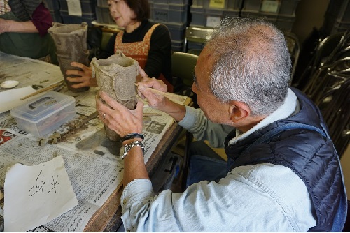 1週目は市川考古博物館の領塚学芸員による基礎知識を学んだ後、用土づくりを行いました。 粘土は市販の粘土に山砂を8対2の割合で混ぜ合せて練り上げました。