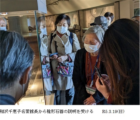 岩宿博物館では名誉館長の相沢千恵子夫人が、相沢氏の日常の研究ぶりについて、発見した「槍先形石器」を前にして説明してくださりました。