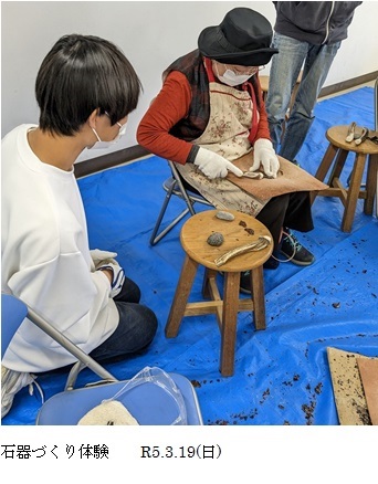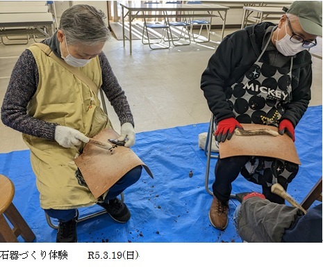 午後からはふれあい学習館で、岩宿博物館友の会・石器作りサークルの方から指導、手ほどきを受けて、