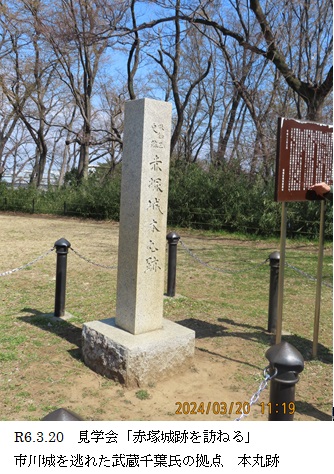 いよいよ、目指す赤塚城跡である。小山の中にあり、周囲は堀を兼ねた深い谷に囲まれ、戦国の雰囲気をひしひしと感じる。説明板には、市川城を逃れた武蔵千葉氏の拠点であることを記している。