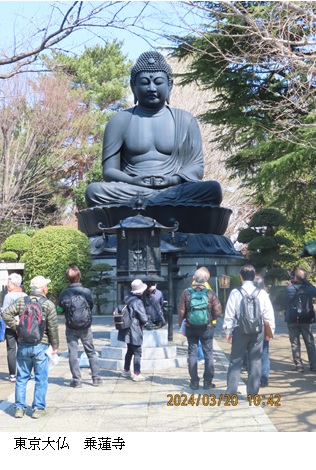 幕府の要請を受け徳丸原で実演した、その志の高さに感服しつつ説明板を見る。乗蓮寺で、東京大仏を見る。休憩と観光目的で立ち寄ったが、大仏の大きさに感動する人も多かった。