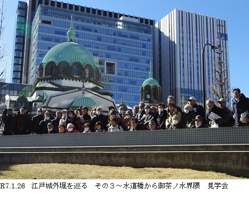 天下のご意見番といわれた旗本大久保彦左衛門屋敷跡、太田道灌が娘の疱瘡回復祈願をした「太田姫稲荷神社」そして「御茶ノ水ソラシテイ」に到着。2班が合流し、軍艦山でニコライ堂をバックに集合写真を撮りました。