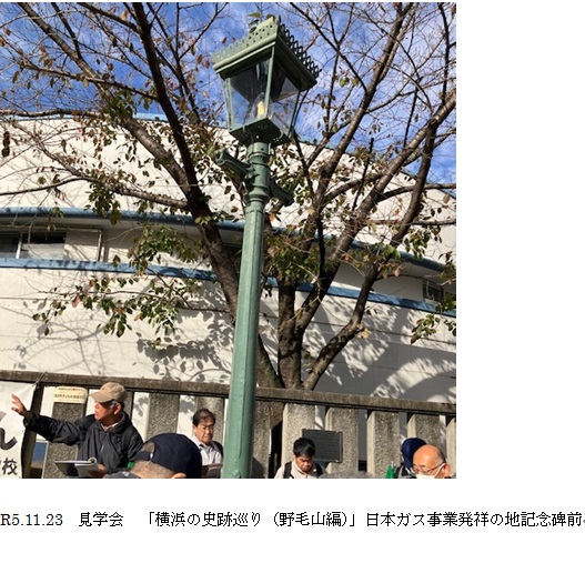 駅前広場で会長の開会挨拶があり、2班に分かれて出発。 「横浜の父」と言われる高島嘉右衛門のガス会社があった「日本ガス事業発祥の地記念碑」を見学、