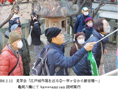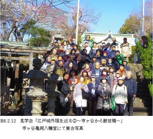 「茶ノ木稲荷神社」と太田道灌が西の守護神として祀った「市谷亀岡八幡宮」を見学して、紅白の梅の花を背に集合写真を撮りました。