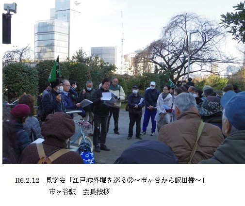 都営新宿線本八幡駅から市ヶ谷駅へ。市ヶ谷見附交番裏の広場で会長の開会挨拶があり、「市谷門跡」を出発、