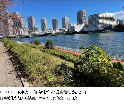 研究発祥の地」、「アメリカ公使館跡」、「トイスラー記念館」など外国人居留地時代の面影を辿りま した。そして再び築地川公園に戻り、そこで現地解散となりました。