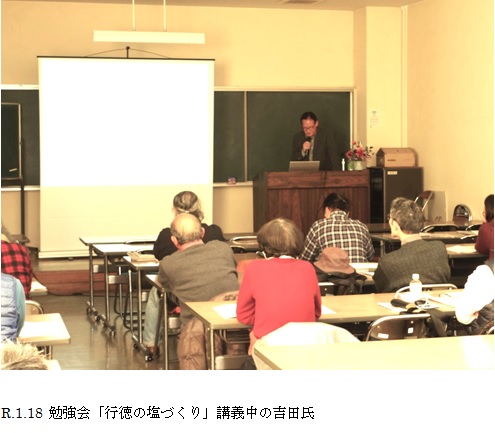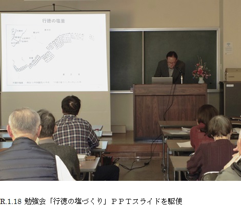 行徳の塩づくりは、「痕跡」を手がかりにして市川行徳の深い地域理解を目的としました。パワーポイント資料によりスライドを多く用いながら理解を深めてもらうことでした。出席者は行徳地区をはじめ、行徳地区以外にも多くみられ、行徳塩に興味や関心を持ってもらえるよう企画しました。